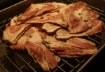 The curing process used in prior versions of pastrami is no different. The navel was brined for 4 days, dried for one, rolled in coriander, black pepper, and pimenton, and, on a day when the temps never reached 20 degrees, smoked for nearly 6 hours. With temperatures so low, the navel never reached the desired temp of 160 degrees, but peaked at just under 150 degrees. The benefit of this is that the pastrami was exposed to a great deal more smoke without rendering a great deal of the fat. After the smoking period ended, the pastrami was chilled and sliced.